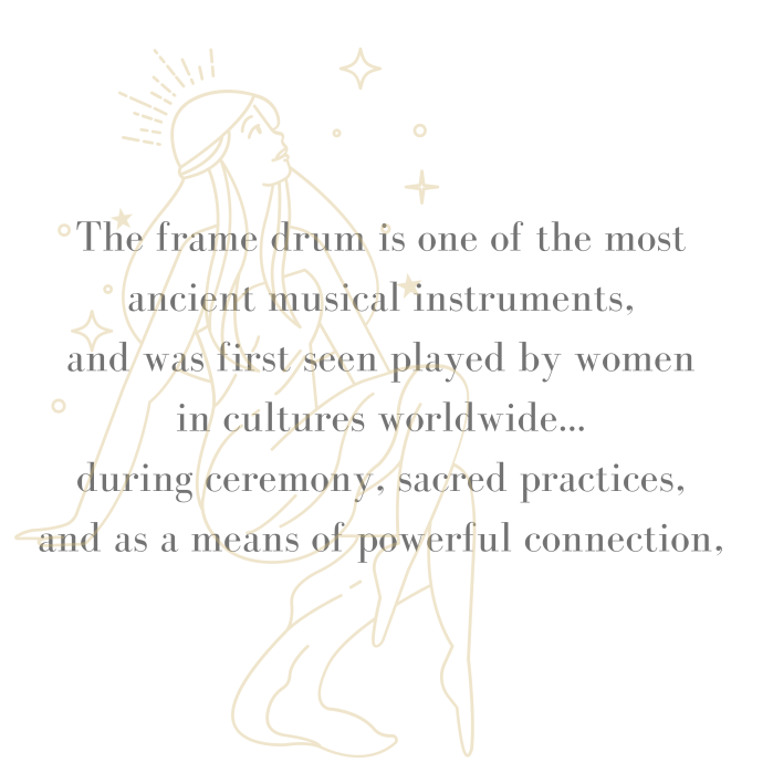 A frame drum is a drum that has a drumhead width greater than its depth, that is held by the hands or rested on the lap. The frame drum is one of the most ancient musical instruments, and was first seen played by women in cultures worldwide, during ceremony, sacred practices, and as a means of powerful connection.